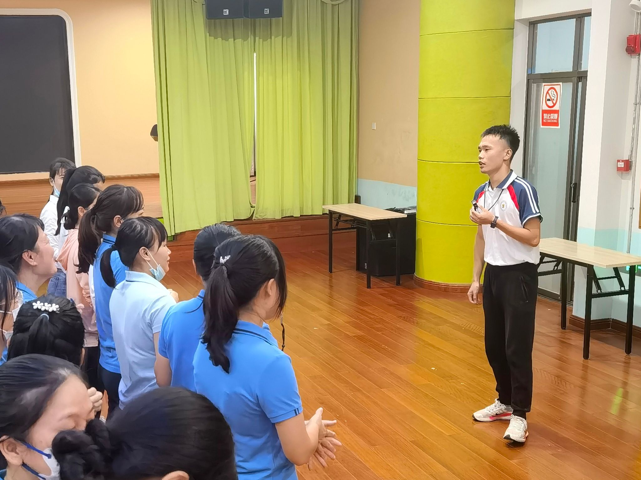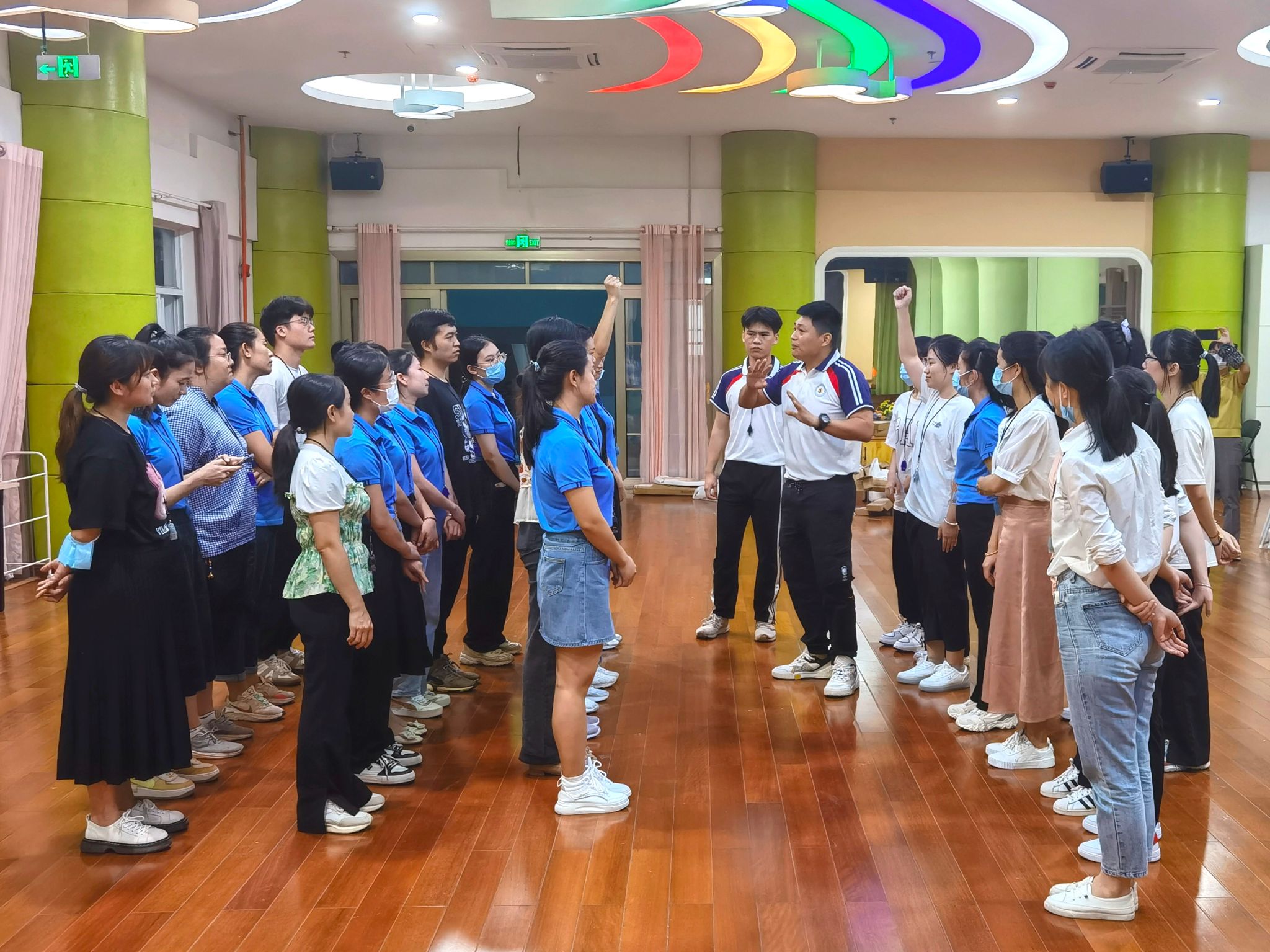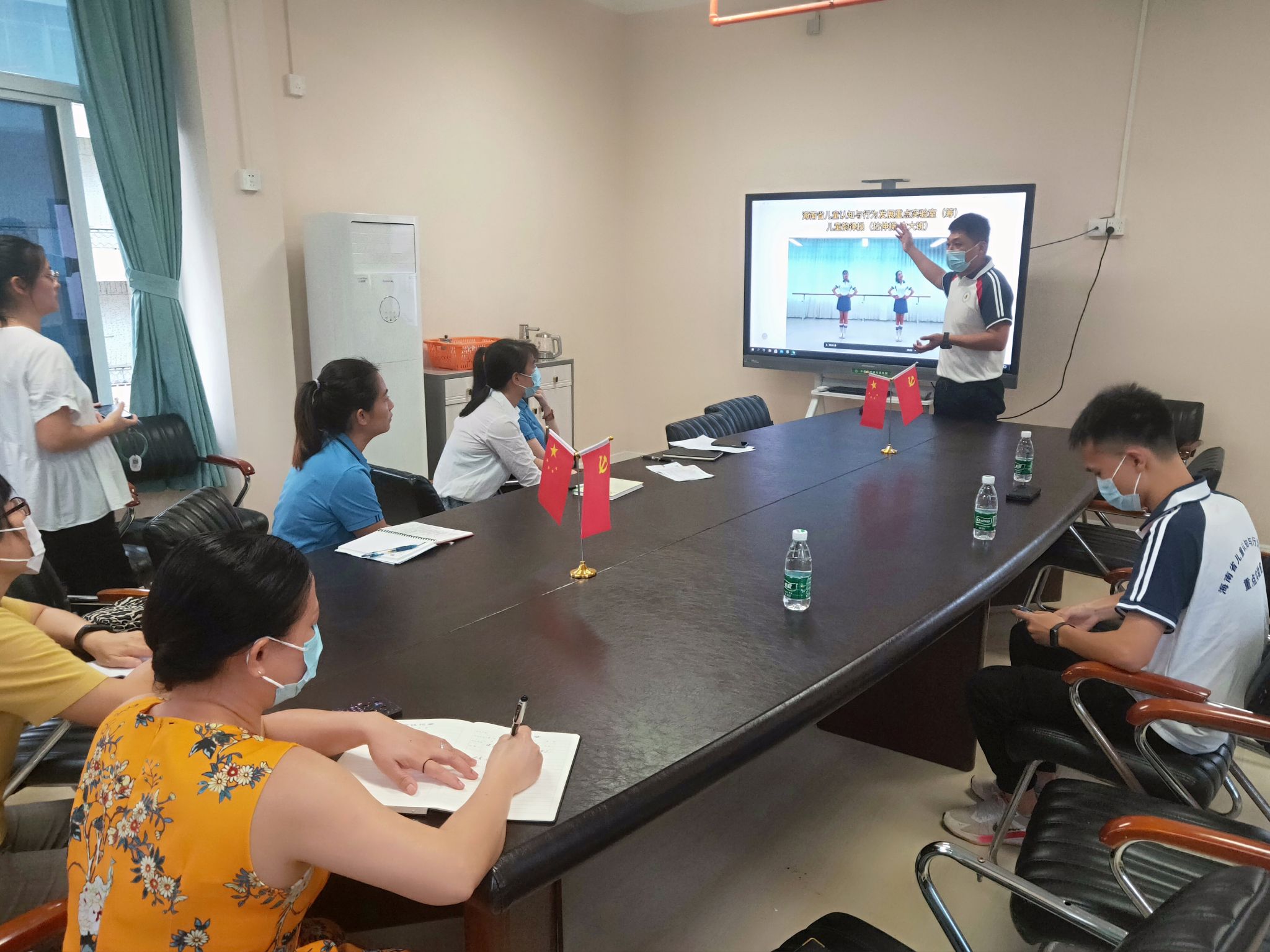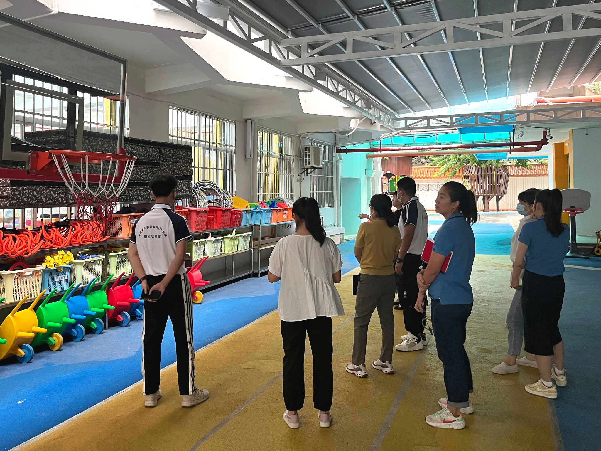 2022年10月24日下午,海南省儿童认知与行为发展重点实验室(筹)热带儿童体质健康研究团队赴海南省直属机关第二幼儿园开展调研与实践活动。本次活动由团队负责人周文龙博士带领杨杰、梁家龙研究人员围绕健康领域教师素养提升、韵律操开发、户外场地器材规划等方面与幼儿园工作者进行研讨与交流。交流活动中,双方就韵律操的开发与户外场地器材规划问题进行了探讨,将进一步提升韵律操开发的适宜性与可行性,完善户外场地器材布局、使用的合理性;杨杰、梁家龙针对幼儿园教师的口哨使用、体育课堂手势、队列队形变化等内容进行了逐一讲解并指导练习,并由幼儿园教师代表进行了队列队形汇报展示;最后周文龙老师总结强调,要将所学技能运用到教学实践中,不断提升自身的体育素养。该活动旨在提升幼儿园教师体育素养、完善幼儿园体育课程建设,提高幼儿体育活动质量,推动幼儿体育发展。后续,重点实验室将继续深入幼儿园开展交流培训活动。